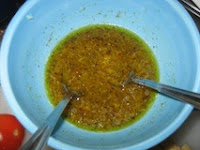 In der Zeit kann man die Vinaigrette machen: Die Schale vonden Limetten abreiben, diese dann durchschneiden und auspressen. Die Knoblauchzehen sehr klein hacken und mit in den Limettensaft geben. Dazu kommt außerdem etwa 8 EL Öl, Salz, Pfeffer, Paprika Gewürz, Chili und etwas Honig (ich glaube ich hatte ca. einen TL). Das Ganze wird nun gut vermischt und erstmal beiseite gestellt.