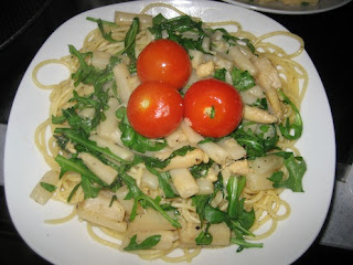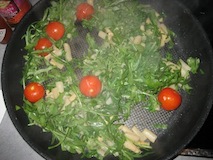 Mit etwas Olivenöl erhitzen wir eine Pfanne und braten dann darin den Spargel an. (Da ist es sicher ein riesen Unterschied, ob man frischen Spargel hat, oder den aus dem Glas, meine wollte, durch das ganze Wasser, nicht braun werden). Die Tomaten dazugeben (sie platzen nach einiger Zeit auf, aber grade bei größeren ist das gut, sonst kann man die schwer essen).Mit Salz und Pfeffer würzen und dann den Rucola kurz mit dazu geben, der soll nur warm werden.