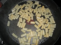 Als erstes den Spargel aus den Gläser nehmen, ihn abtropfen lassen und in Stücke schneiden. Da der Spargel noch ziemlich stark nach saftet ist es sinnvoll in jetzt noch eine Weile in einem Sieb stehen zu lassen.
