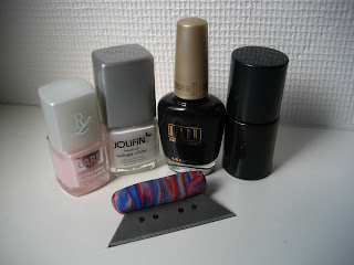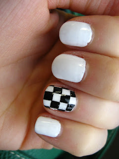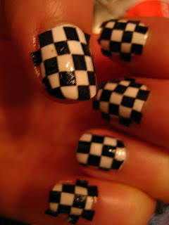 Ich hab einfach schwarzen Nagellack auf eine Folie gemacht, das ganze gut trocknen lassen (über Nacht) und dann mit einer Rasierklinge kleine Quadrate raus geschnitten und diese dann auf die weiß lackierten Nägel gebracht. Fertig :)