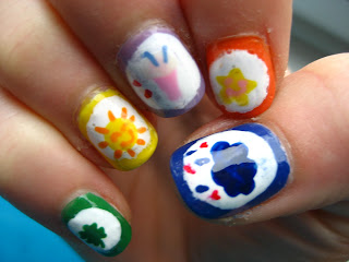 War nicht ganz so einfach. Ich habe die Symbole auf Folie gemalt und und dann auf die farbigen Nägel geklebt. Leider sind dabei einige Bläschen entstanden... Aber trotzdem gefällt mir das Design super gut!!!
