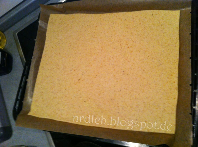 Das ganze wird dann auf das Backblech zugeschnitten und darauf gelegt.