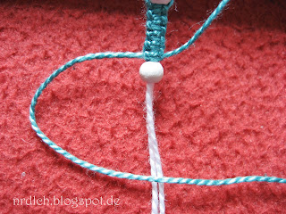 Ich habe bei diesem Armband immer nach 10 Knoten eine weiße Holzperle auf das Band geschoben und dann den nächsten Knoten um die Perle herum gemacht.