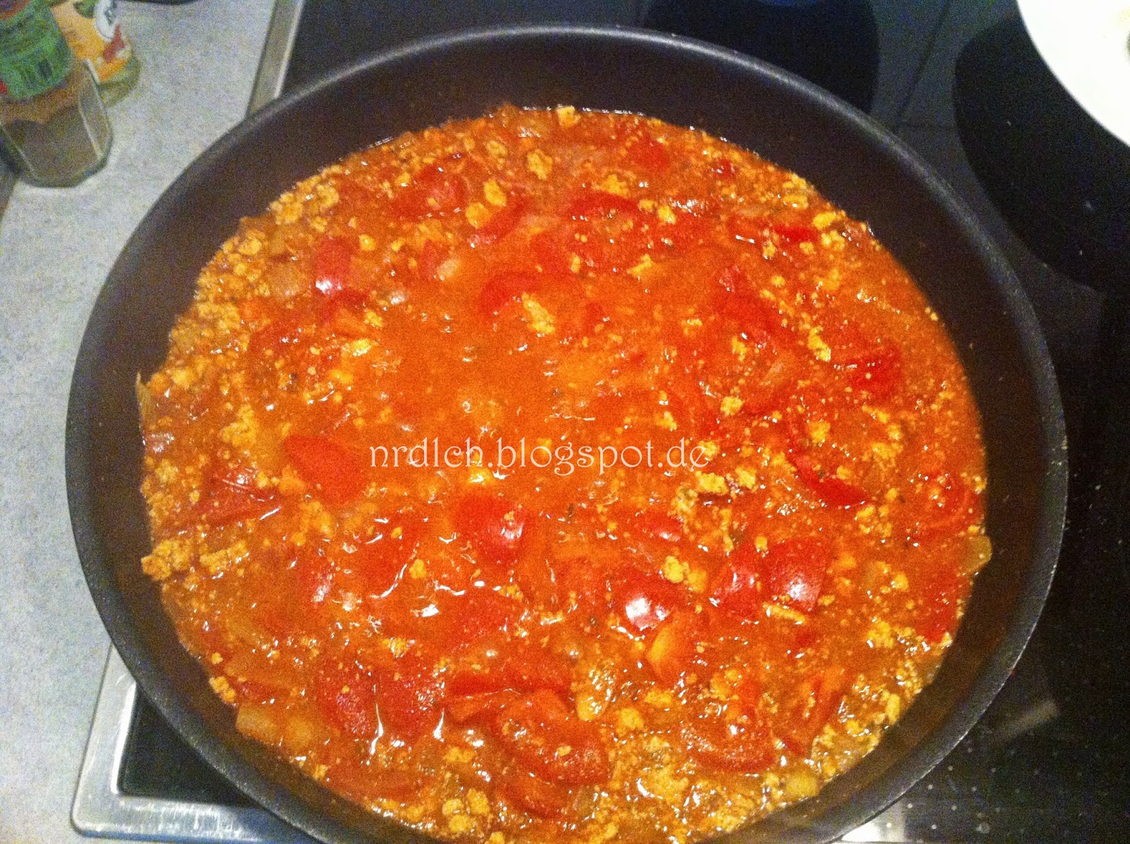Die Zwiebeln werden kurz in Öl angebraten, dann der Tofu dazugegeben. Wenn dieser leicht angebraten ist können die Tomaten hinzugegeben werden und ebenso die Gemüsebrühe, Tomatenmark und Kräuter.